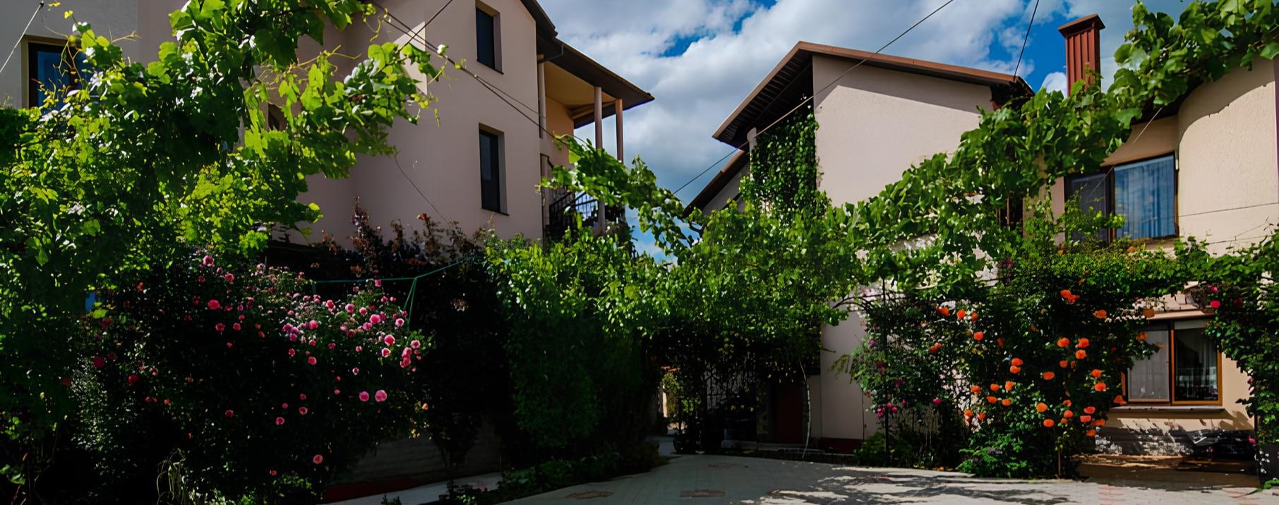 Вы будете чувствовать себя здесь как дома. Двор вымощен красивой тротуарной плиткой. Крымские сосны, тис, шикарный розарий, виноградник, цветущие однолетники, розмарин, лаванда, герань формируют сплошную «зеленую крышу» над всем двориком, создавая особый микроклимат и прохладу даже в самое жаркое время года. У нас есть все необходимое для удобного проживания: детская площадка для игр, уютный уголок с беседкой и мангалом, автостоянка. Территория закрытая, ведется видеонаблюдение по периметру.