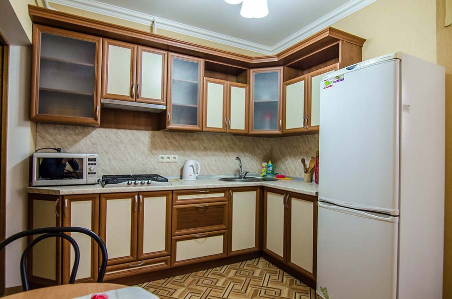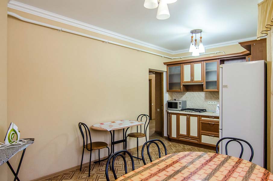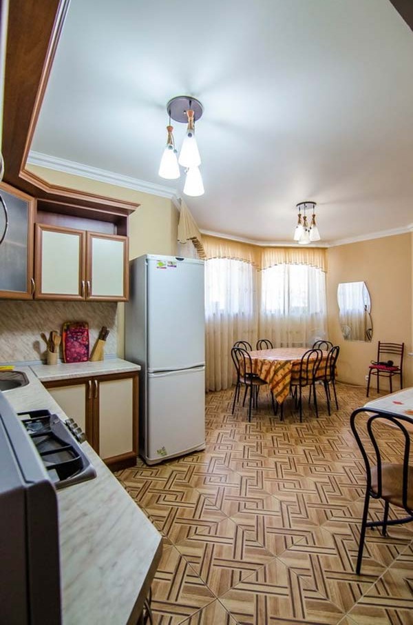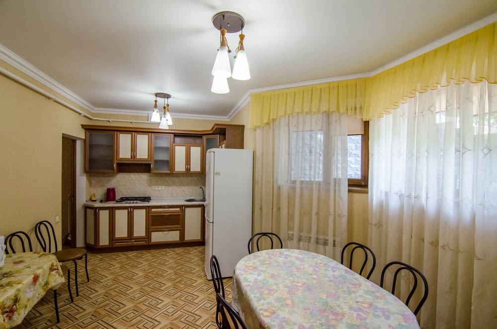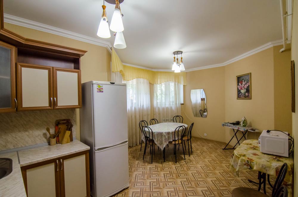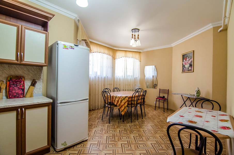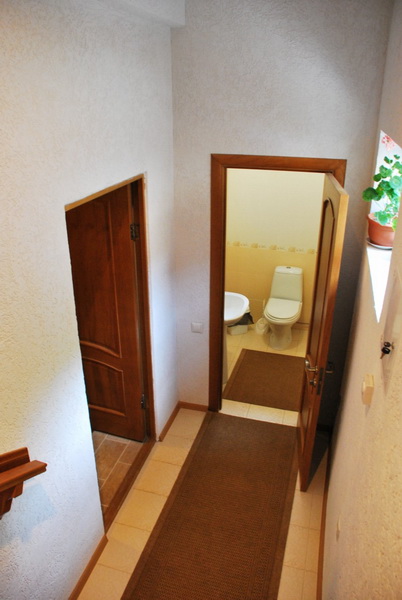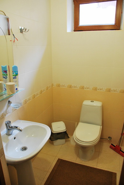 2-й - унитаз, раковина, зеркало с полочкой, мыло для рук, дез. средства, туалетная бумага, мешки для мусора;. - Кухня-столовая (19,8 м2) укомплектована посудой, фраже и др.мелочами, миксер (предоставляется по запросу), моющие ср-во д/посуды, тряпочки, губка, мешки для мусора, холодильник, газовая поверхность, электрочайник, микроволновая печь, миксер, большое зеркало, телевизор-плазма (размещен на стене).