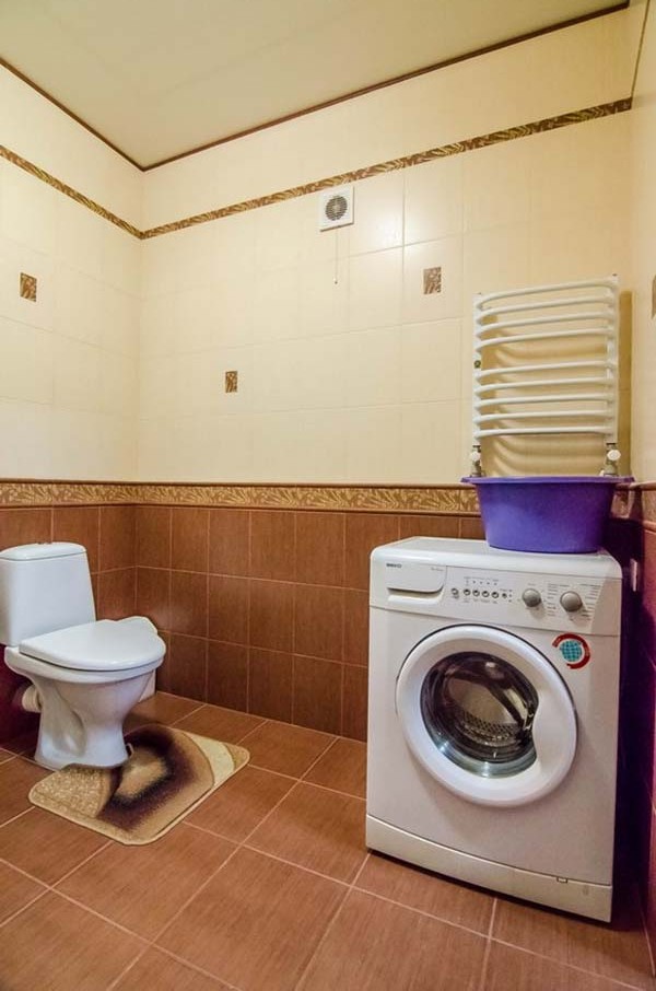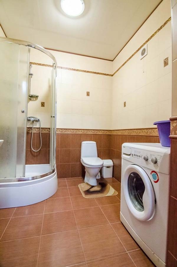 1-й - унитаз, раковина с тумбой, зеркало с полочкой, душевая кабина, стиральная машина, сушилка для белья, фен для сушки волос, мыло для рук, дез. средства, туалетная бумага, мешки для мусора;