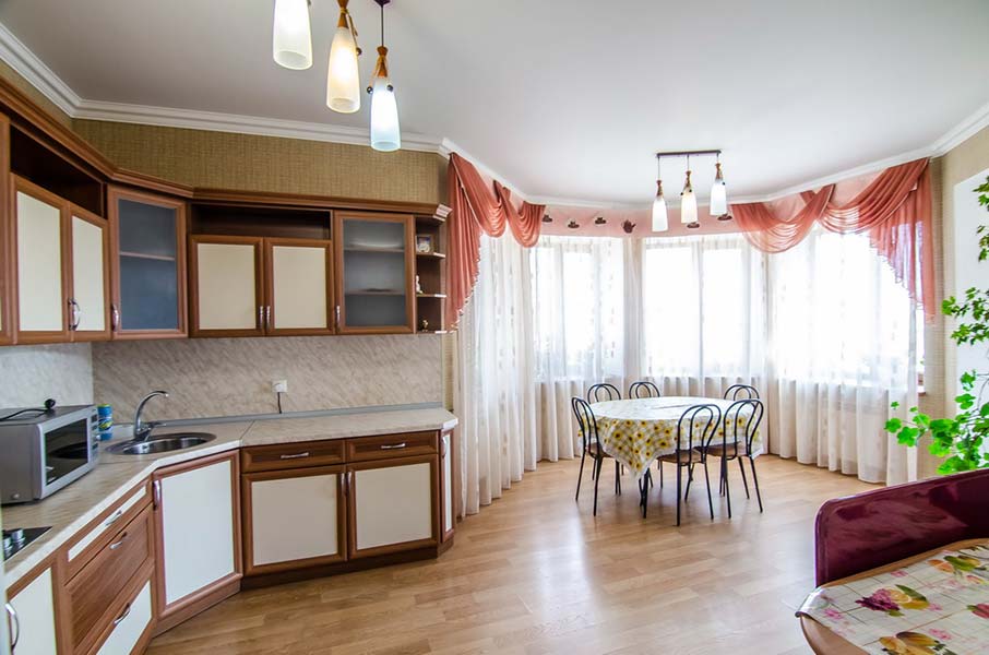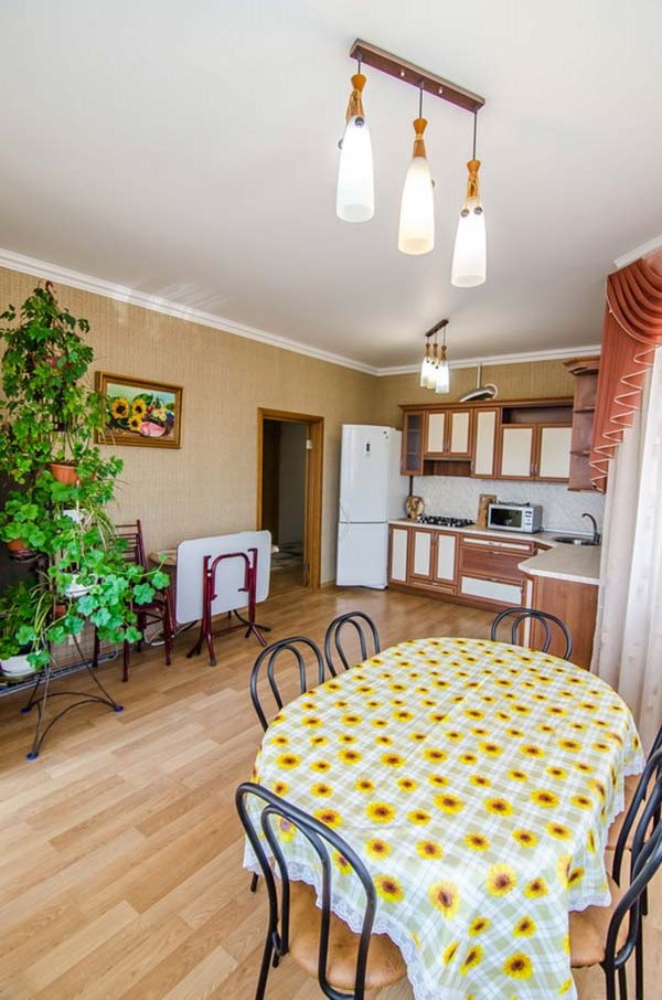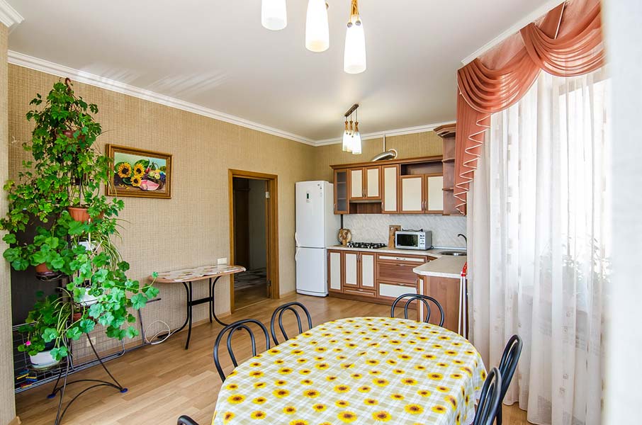 - Кухня(20,6 м2) со столовой укомплектована посудой, холодильник, газовая поверхность, эл. чайник, микроволновая печь, миксер (предоставляется по запросу).